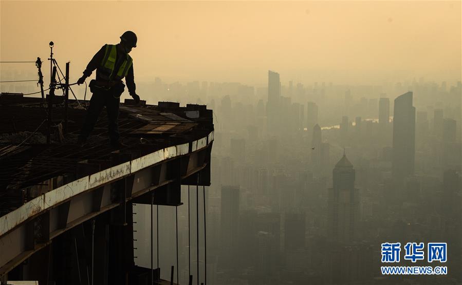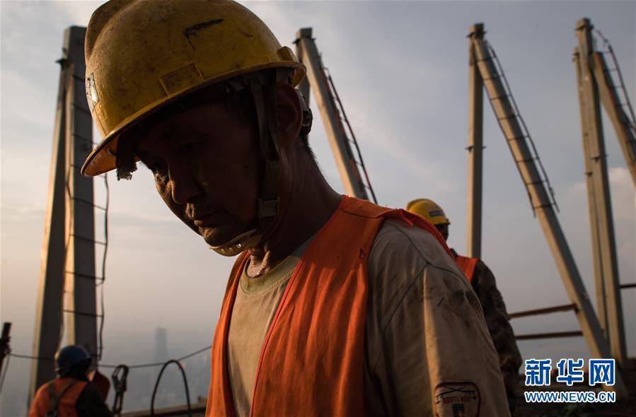 8月11日傍晚,工人在武漢綠地中心項目建設現場近500米的高空施工。新華社記者肖藝九攝