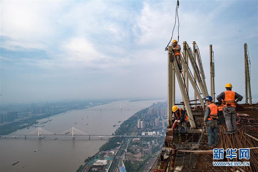 8月11日,工人在武漢綠地中心項目建設現場近500米的高空施工。新華社記者肖藝九攝