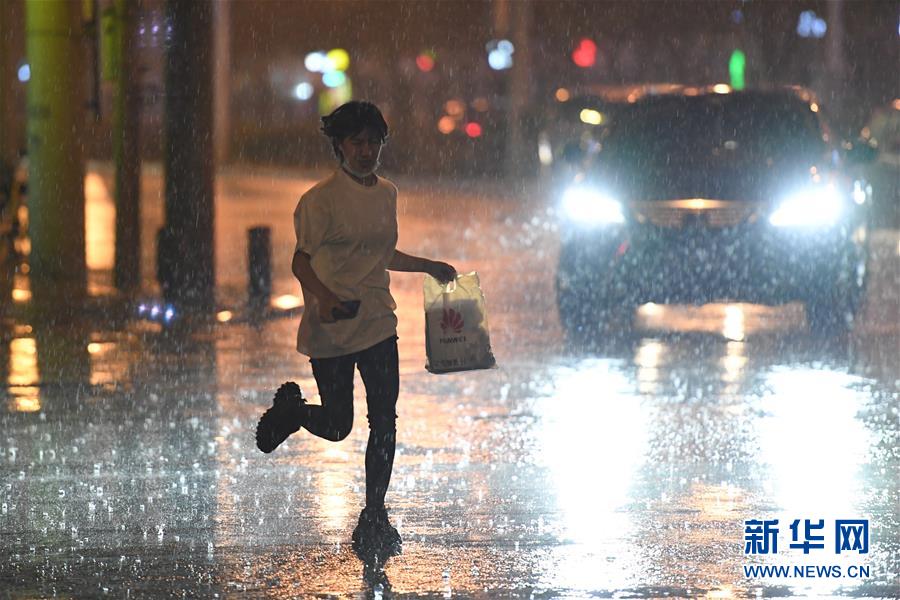 8月12日,在北京市朝陽區一路段,行人冒雨出行。新華社記者 鞠煥宗 攝