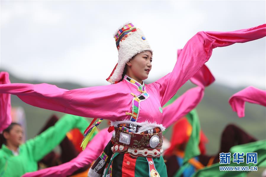 8月12日,演員在開幕式上表演舞蹈。當日,2020中國碌曲鍋莊舞展演暨甘南藏族自治州第六屆少數民族傳統體育運動會在甘肅省甘南州碌曲縣夏澤灘草原上舉行。開幕式上,三千余名身著節日盛裝的演員和當地群眾在草原上起舞,雨后初晴的草原上充滿歡聲笑語。新華社記者 耿馨寧 攝