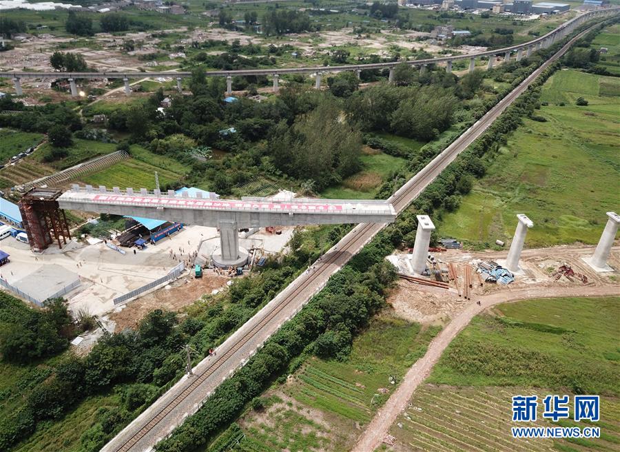 這是8月12日拍攝的水蚌鐵路蚌埠段改線工程東站疏解線特大橋跨越京滬鐵路上行線轉體梁轉體施工現場(無人機照片)。新華社記者 劉軍喜 攝