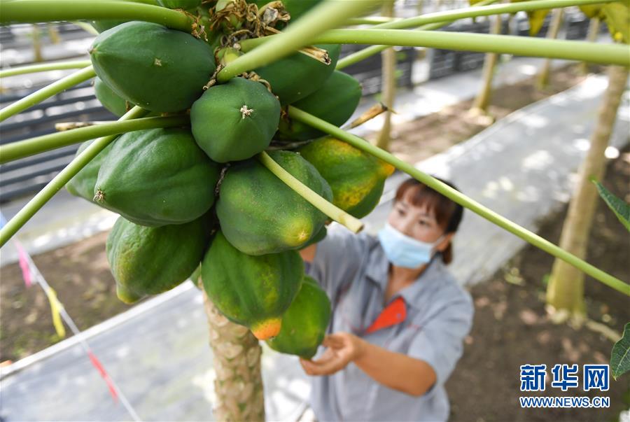 在吉林省永吉縣萬昌鎮宇豐紅果木瓜產業園,工作人員在大棚內管護木瓜(8月12日攝)。新華社記者 許暢 攝