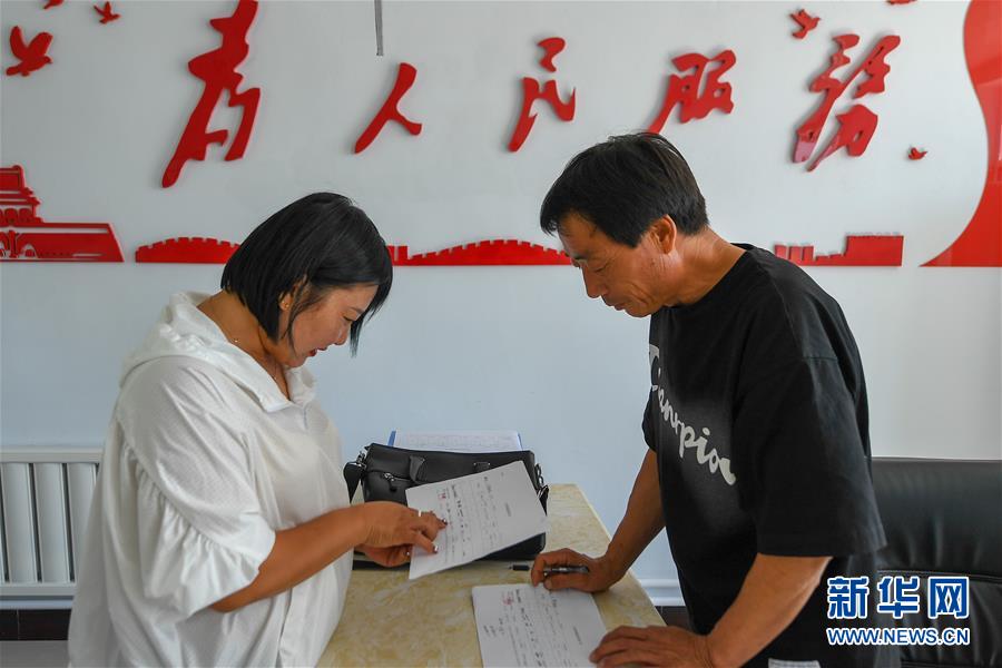 8月12日,在鎮賚縣黑魚泡鎮岔臺村,村民包春苗(左)在便民服務大廳辦業務。新華社記者 張楠 攝