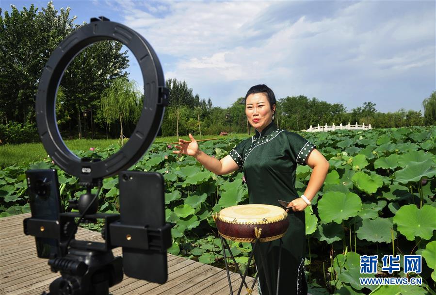 8月13日,河北省河間市西河大鼓非遺項(xiàng)目藝人李雪通過網(wǎng)絡(luò)直播表演西河大鼓。暑假期間,河北省河間市文化館推出非遺展演“云端”播系列活動(dòng),組織當(dāng)?shù)匚骱哟蠊姆沁z項(xiàng)目傳承人利用視頻直播的方式進(jìn)行線上展演,通過“云端”傳承非遺文化。新華社記者朱旭東攝