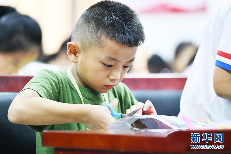 8月13日,貴州省思南縣雙塘街道麗景社區易地扶貧搬遷安置點的孩子在學習剪紙。新華社記者楊文斌攝