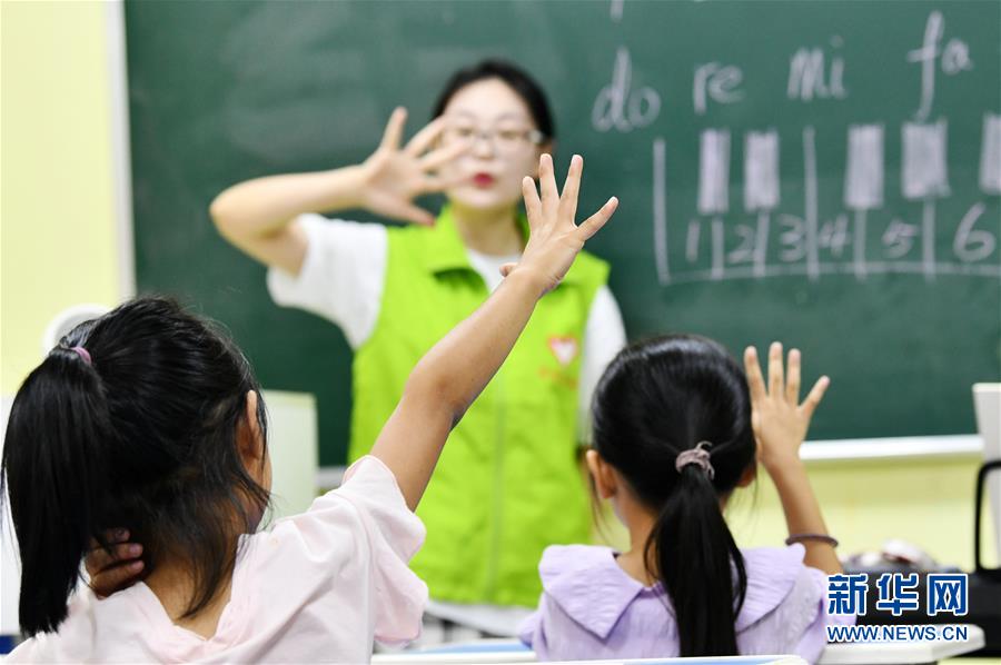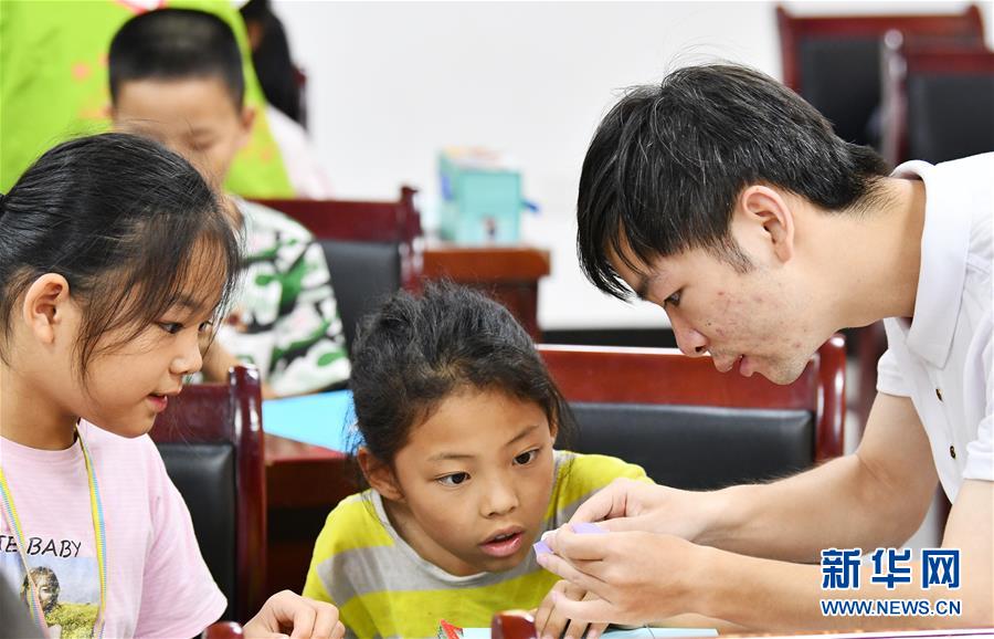 8月13日,在貴州省思南縣雙塘街道麗景社區易地扶貧搬遷安置點,志愿者在給孩子們上音樂課。今年暑假期間,在貴州省銅仁市思南縣雙塘街道麗景社區易地扶貧搬遷安置點,來自北京有研集團和思南當地的志愿者們利用暑期時間,給安置點的孩子們進行音樂、體育、手工、安全教育等課程輔導,幫助搬遷戶照看孩子,讓孩子們在學習中度過一個快樂而有意義的暑假。新華社記者楊文斌攝