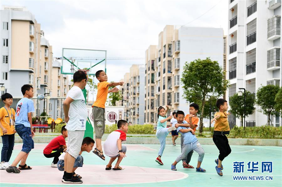 8月13日,在貴州省思南縣雙塘街道麗景社區易地扶貧搬遷安置點,孩子們和志愿者在丟沙包。新華社記者楊文斌攝