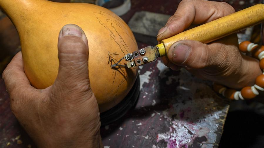 8月5日,侯景偉在葫蘆上進行創作。經過多年潛心研究,他將浮雕和烙畫工藝相結合,通過拋光、起稿、雕刻、烙燙、套色等十余道工藝,制作展現傳統文化、民俗故事的葫蘆工藝品。