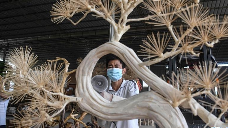 8月7日,一名工人在永福縣永安鄉根雕工藝品就業扶貧車間搬運根雕半成品。新華社記者 張愛林 攝 這是8月7日在永福縣永安鄉根雕工藝品就業扶貧車間拍攝的根雕工藝品。