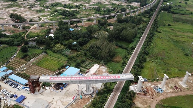 8月9日,中鐵十一局承建的粵港澳大灣區基礎設施“硬聯通”重點工程——廣州南沙港鐵路跨西江特大斜拉橋完成最后一塊鋼箱梁吊裝作業,大橋即將合龍。