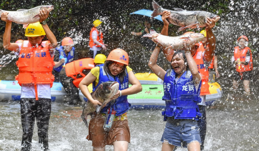 2019年8月2日,廣東清遠,臺風“韋帕”不但帶來風雨,還給游客帶來捕魚之樂。