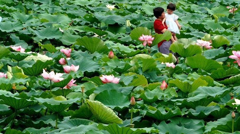 近日,河南鄭州紫荊山公園內的荷花陸續綻放,吸引大批市民和游客前來觀賞。