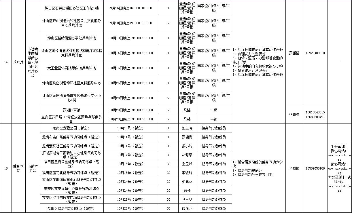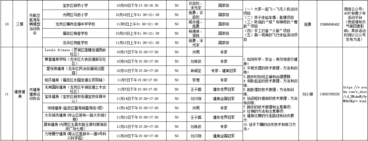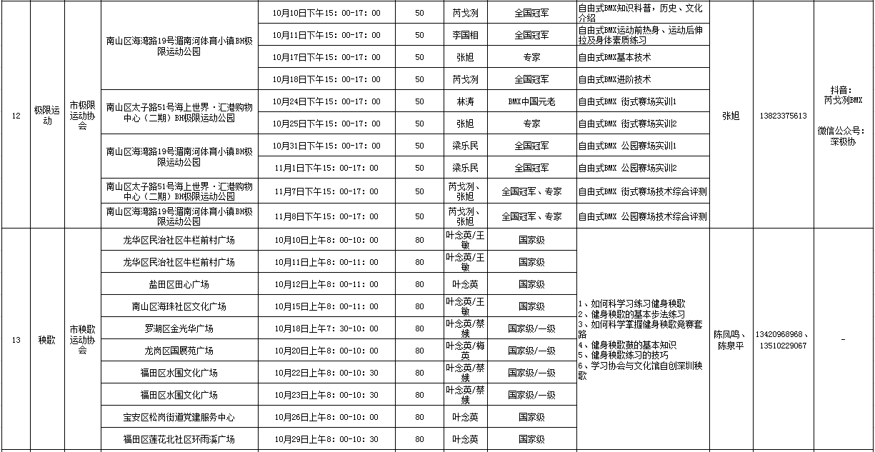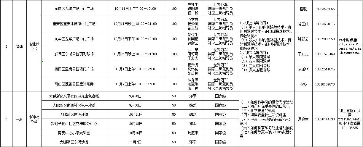 專題會現場,15家體育社會組織機構發揮各自優勢,建言獻策各展神通。經統計,即日起至11月29日,15家體育社會組織機構將通過媒體宣傳、微信公眾號、官方網站、線上點播直播、深入社區及走進公園等方式,在全市各區開展運動防損傷、運動基礎知識及要領、實地練習等123項系統性的科學健身指導活動,內容涵蓋沖浪、瑜伽、航空航海、跑步、秧歌、網球、極限及居家運動等十余種常見運動。具體活動安排與參與方式可詳見文末圖片。