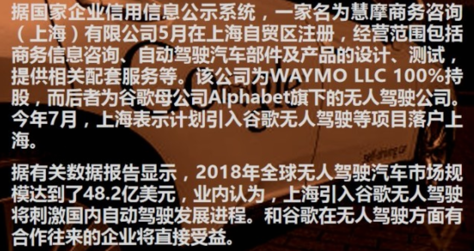 谷歌母公司Alphabet旗下研究自動駕駛的部門Waymo在自動駕駛領域處于全球領先水平,當前其已經完成800萬英里(約1287萬公里)自動駕駛汽車公共道路測試,模擬測試里程達到50億英里(約80.47億公里)。Waymo計劃在為今年下半年向部分地區的美國消費者推出無人駕駛服務。