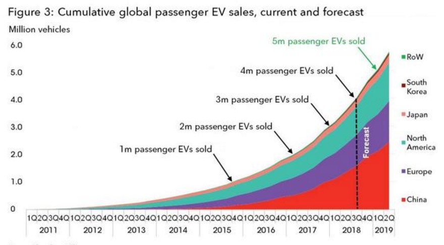 預計全球電動車累計銷量突破500萬僅需6個月時間,即到2019年3月份。未來電動車銷量的增長約42%的份額將會來自中國市場,而歐洲和北美則將分別貢獻26%和25%。(林淼)