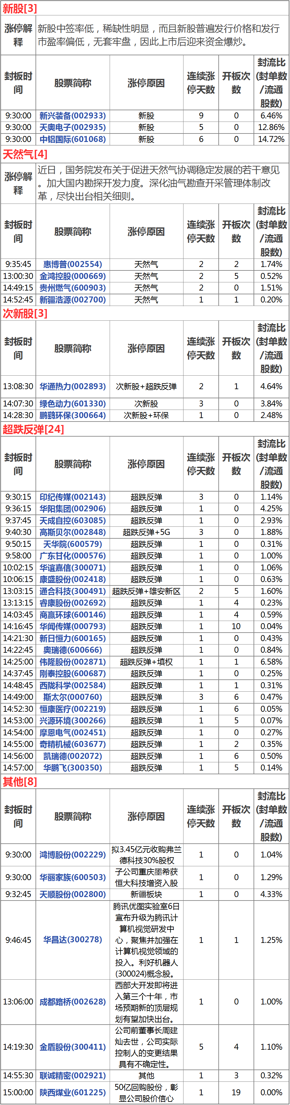 今天漲停家數較上一交易日有所增加,兩市共42家漲停;跌停6家。成交量方面,滬市成交1138億元,深市成交1582億元,兩市總成交額約為2720億元,較上一交易日放量224億。盤面上燃氣水務、黃金、煤炭等板塊漲幅前;電子發票、國產軟件、芯片等板塊跌幅居前。