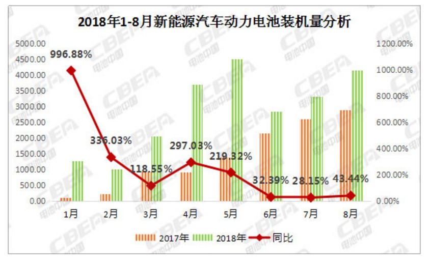 智通財經APP獲悉,據動力電池應用分會研究部分析數據顯示,2018年8月,我國新能源汽車動力電池裝機量約4.17Gwh,環比增長25%,同比增長43.44%;1-8月累計裝機總量約22.97Gwh。