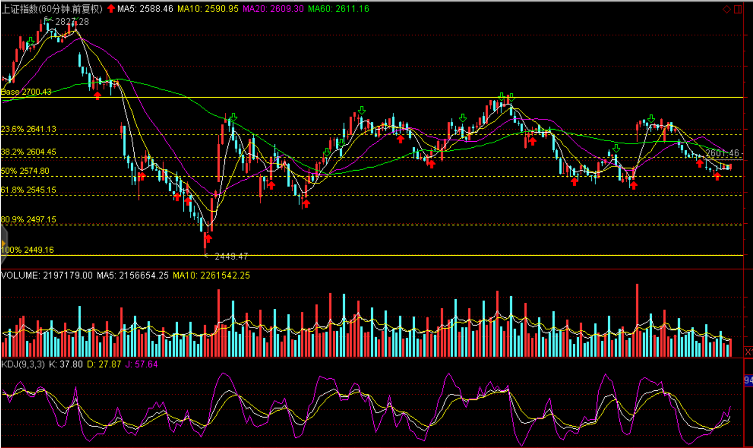 技術面:短期企穩回升,弱勢反彈,60分鐘黃金分割線滬綜指2604點、2641點、創業板1360點一線存在壓力。