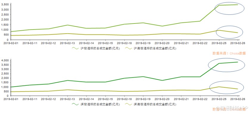 隨著兩地逐漸趨于技術牛市的形態,2月的滬(深)股通、滬(深)港股通標的總成交金額折線一路向上,近兩日驟然上揚。
