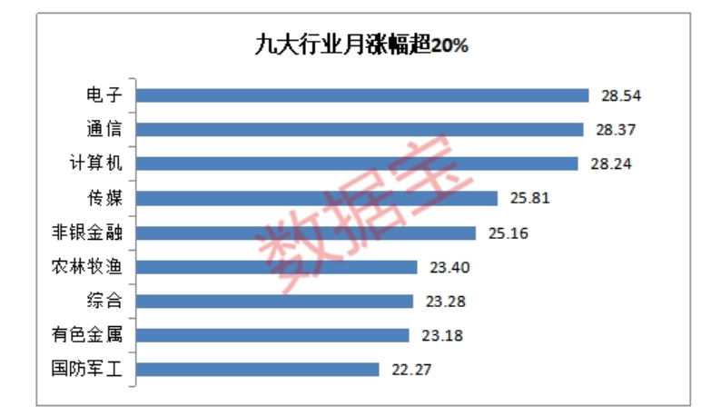 28個申萬一級行業中,有9個行業二月份的漲幅超過20%,電子、通信、計算機、傳媒、非銀金融行業漲幅超過25%,位列前五。28個行業的月平均漲幅為18.4%,行業普漲現象明顯。
