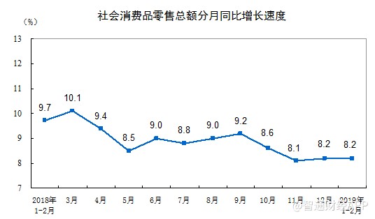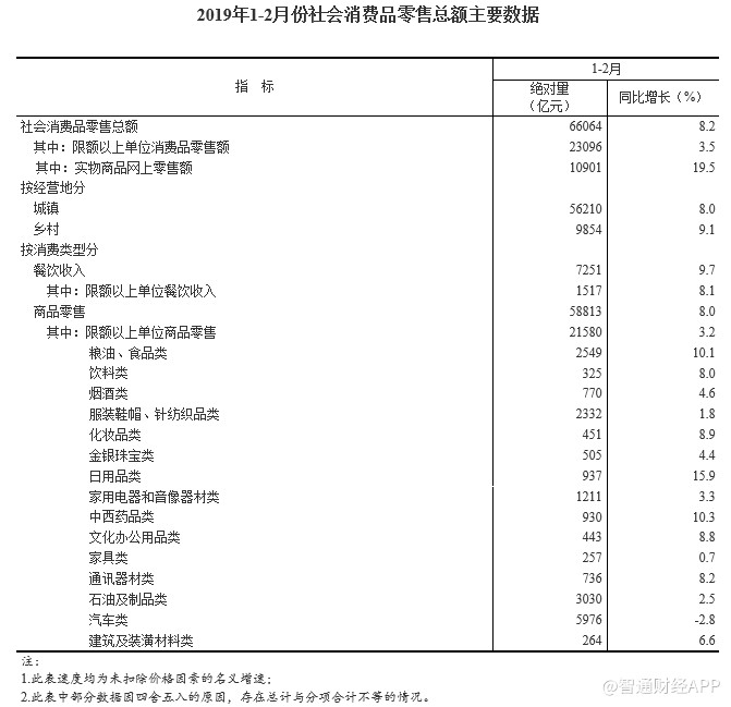 智通財經APP獲悉,國家統計局公布,2019年1-2月份,社會消費品零售總額66064億元,同比名義增長8.2%,符合預期,但低于前值增長9%。其中,限額以上單位消費品零售額23096億元,增長3.5%。