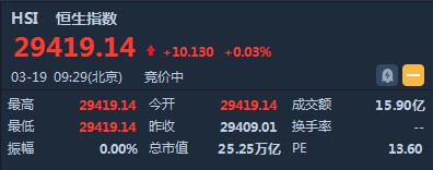 智通財經APP獲悉,恒生指數開盤漲0.03%,報29417.14點。國企指數漲0.06%,報11681.76點。紅籌指數跌0.12%,報4675.12點。大市盤前成交15.9億港元。隔夜美股三大股指集體收高。今日清晨,香港金融管理局再度入市干預,買入20.1億港元,以捍衛聯系匯率機制,此乃金管局今年第3度出手。
