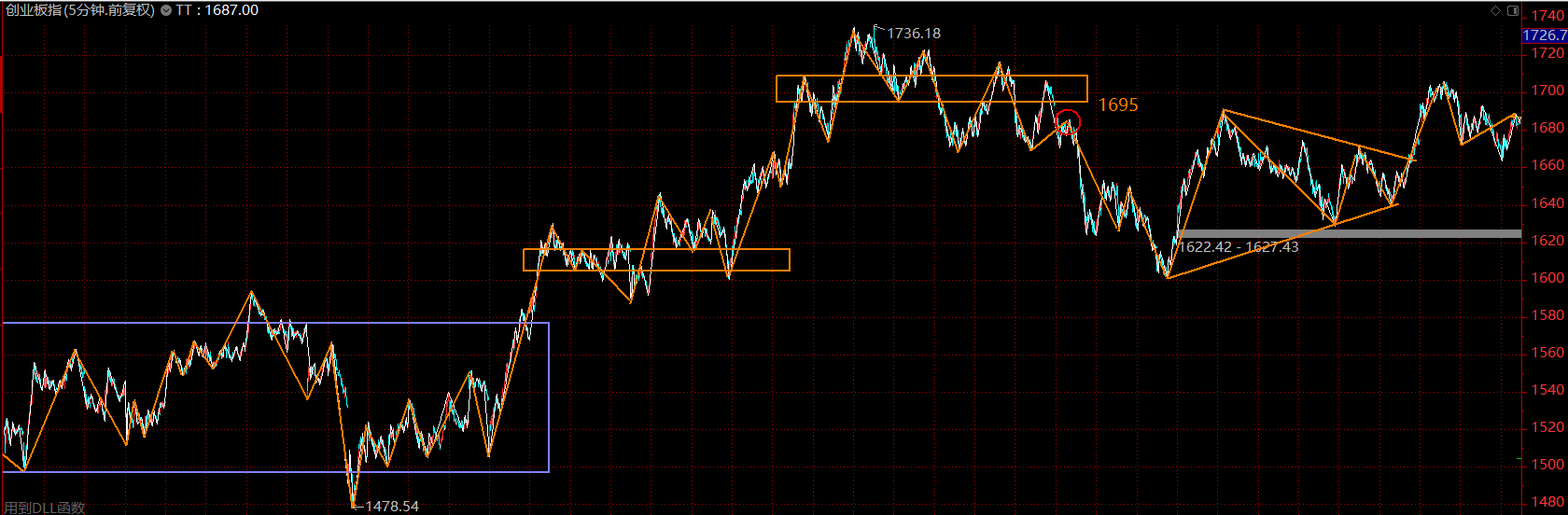 創業板形態上是一個三角形收斂突破的回踩,基本認定這里短線整固結束,本周大概率會沖擊前高1736點,盡量持股待漲。點位來看,短線1670點附近較為關鍵。