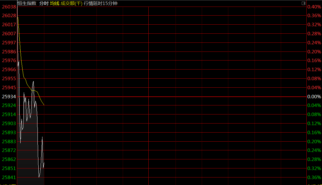 恒生指數開盤跌1.15%,報25925.09點。國企指數跌1.2%,報10575.62點。紅籌指數跌0.75%,報4255.89點。大市盤前成交17.25億港元。