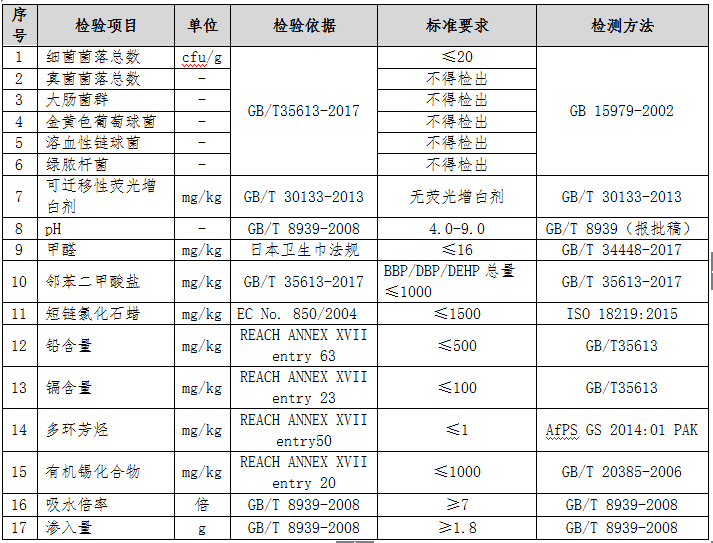 安全性能指標包括微生物、甲醛、pH、可遷移性熒光增白劑、化學物質等五個方面。