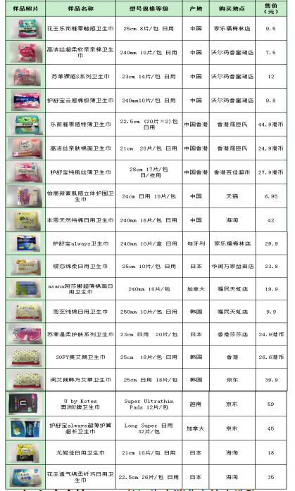 據前期調研發現,國外品牌衛生巾更受女性消費者青睞,很多消費者認為國外品牌衛生巾質量更優更值得信賴,進而選擇跨境或海淘等方式購買國外產品。因此,本次樣品分別從深圳商超、香港、線上海淘購買樣品進行測試和比較,樣品涉及11款國外原裝產品。詳見下表。