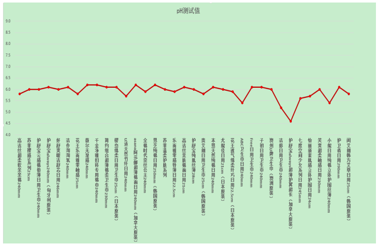 女性特殊時期的抗病能力大大降低,而與皮膚密切接觸的衛生巾的酸堿度即pH值是關乎女性特殊時期健康的重要因素。據婦幼保健醫生介紹,衛生巾的pH值在弱酸性至堿性對人體最安全。本次比較試驗35款衛生巾pH值測試結果均在4.5到6.5之間,對人體無害。pH值測試結果見下圖。