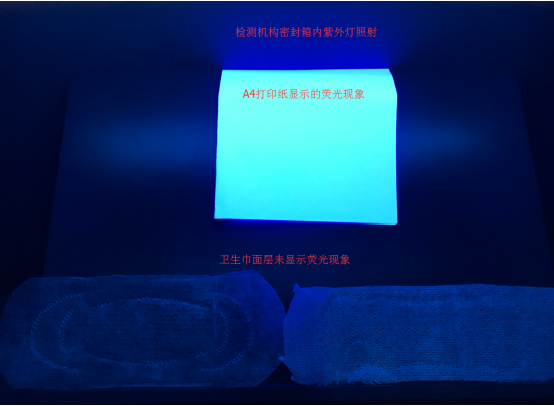 下圖為含有熒光增白物質的紙張與衛生巾樣品測試對比圖