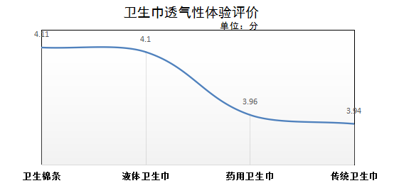 在本次主觀體驗透氣性方面,衛生棉條評價最高,平均得分4.11分;其次是液體材料衛生巾,平均得分4.1分;藥用衛生巾和傳統型衛生巾透氣性評價稍遜,平均得分分別為3.96和3.94分。