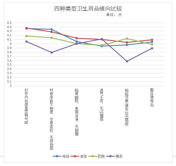 在“打開內包裝是否有氣味”體驗中,液體材料衛生巾平均得分4.37分,備受好評;傳統衛生巾次之。