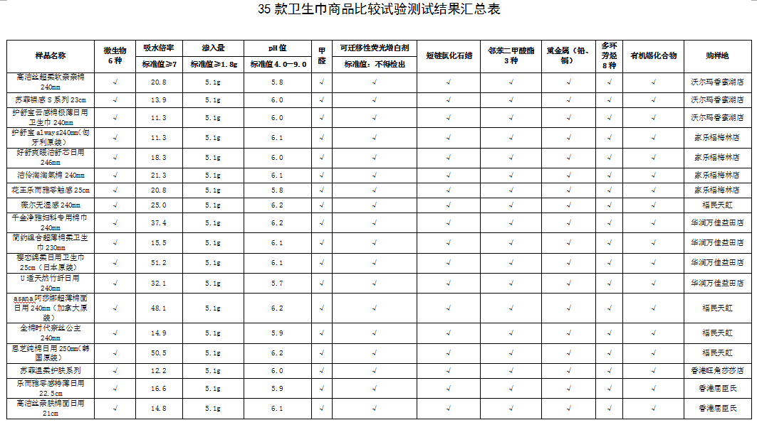試驗結果表明參與比較試驗的35款衛生巾產品,從安全指標方面來看未檢測出超標問題;使用性能指標方面也均達到測試標準,女性消費者可放心選購。