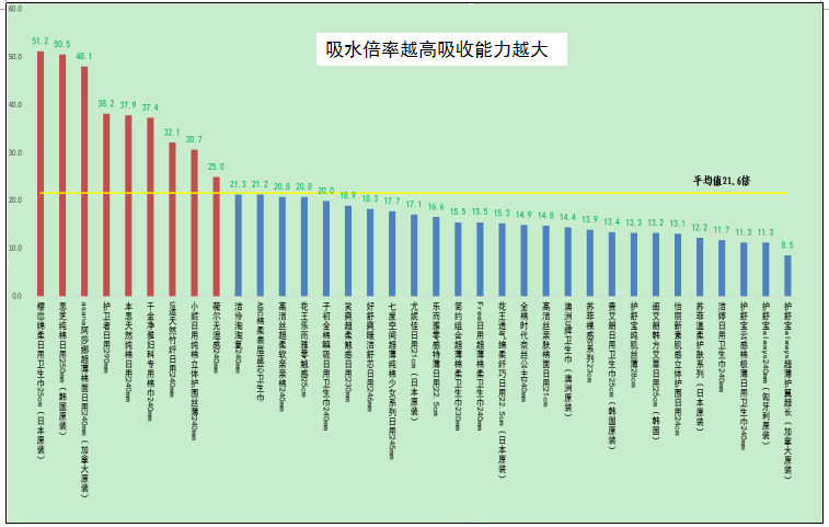 2.35款衛生巾吸水倍率有差別,吸水倍率最高的前三名和最低的三款均為國外品牌。