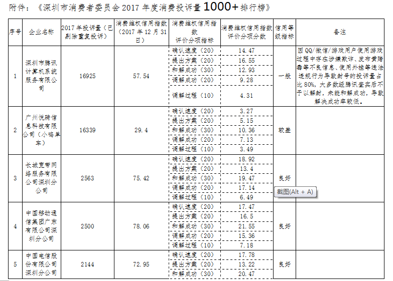 騰訊得“第一”,小鳴單車成最差——深圳市消費者委員會2017年度消費投訴量1000+排行榜發布