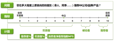 NPS計算模式:?請用戶回答“您在多大程度上愿意向您的朋友(親人、同事……)推薦XX公司/產品?”根據用戶的推薦意愿,將用戶分為三類:推薦者(得分在9-10之間)、被動者(得分在7-8之間)、貶損者(得分在0-6之間)。?推薦者與貶損者是對企業實際的產品口碑有影響的用戶,推薦者與貶損者用戶在用戶總數中所占百分比之差,即凈推薦值,如右圖所示。?據相關調查顯示,大部分公司的NPS值在5-10之間。