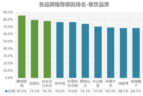 排名第一的是鵬城飯館,餐飲品質推薦率為85.6%;其次是田園樂,推薦率為79.5%;第三名是友友山谷農莊,推薦率為78.2% 。