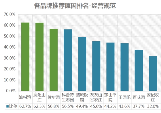 經營規范推薦率排名前三依次為:油柑灣、鹿咀山莊、俊華園;