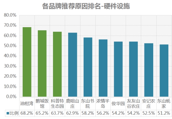 排名第一的是油柑灣,硬件設施推薦率為68.2%;其次是鵬城飯館,推薦率為65.2%;第三名是科普特生態園,推薦率為63.7% 。