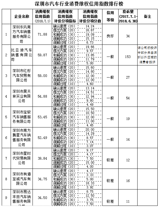 數據顯示,在49家企業中排名前三的企業分別是:深圳東風南方汽車銷售服務有限公司,消費維權信用指數71.88,信用等級良好;比亞迪汽車銷售有限公司,消費維權信用指數59.87,信用等級一般;深圳市紅彤汽車貿易有限公司,消費維權信用指數59.00,信用等級一般。比亞迪汽車銷售有限公司因經銷商遍布各地,故有部分深圳以外區域的消費者投訴。本次排名后三的企業是:深圳市標域汽車有限公司,消費維權信用指數3.29,信用等級差;深圳標特汽車(集團)有限公司,消費維權信用指數2.45,信用等級差;深圳市宏創陸風汽車銷售有限公司,消費維權信用指數0,信用等級差,排名最后。