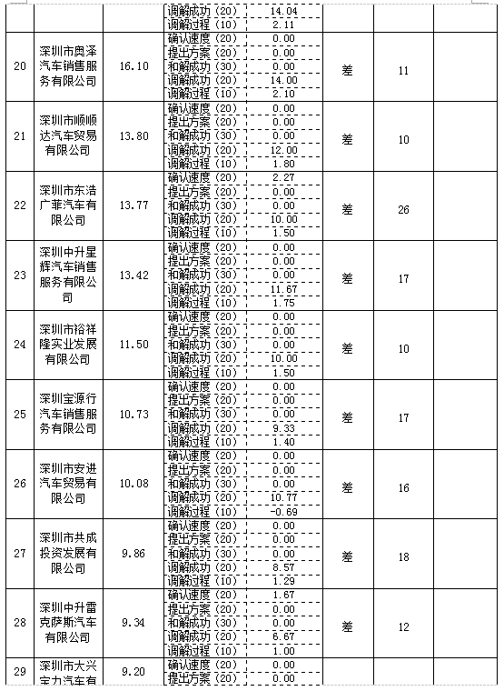 在細分指標方面,深圳市標域汽車有限公司、深圳標特汽車(集團)有限公司和深圳市宏創陸風汽車銷售有限公司等27家企業處理投訴不及時,未積極與消費者先行和解,導致其企業“確認速度”、“提出方案”和“和解成功”三項分項指標的分數皆為0,嚴重影響了企業的消費維權信用指數和信用等級。深圳市仁孚特力汽車服務有限公司、深圳市安進汽車貿易有限公司和深圳市大興寶譽汽車銷售服務有限公司在由消委會工作人員評分的“調解過程”分項指標分數為負分,3家企業存在不配合調解甚至拒絕調解的情況,解決消費糾紛的誠意度較差;另外,深圳市宏創陸風汽車銷售有限公司的消費維權信用指數為0,誠意度和滿意度為0,10宗消費投訴皆未處理成功,排名最后。