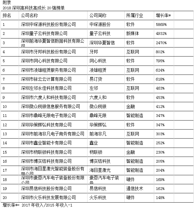 今年,榮登“深圳20強”三甲的獲獎企業分別為深圳中琛源科技股份有限公司、深圳量子云科技有限公司和深圳前海華夏智信數據科技有限公司,他們在過去三年中表現出的平均增長率分別為5,869%、4,932%和2,470%。本年度入選“深圳20強”的企業除了軟件、硬件、互聯網和通訊技術外,也不乏其他新興領域,如新媒體、智能制造和金融科技。此外,為表彰深圳市當地表現優秀且極具潛力的初創企業,今年共有20家企業獲選“深圳明日之星”,它們來自多個不同的領域,包括人工智能、智能設備、電子商務、教育、生物醫藥、金融科技和互聯網平臺服務等 (詳見附錄)。獲選成為“深圳20強”和“深圳明日之星”的企業,將自動成為“中國高科技高成長50強”(簡稱“中國50強”)和“中國明日之星”的候選企業,并在今年11月與全國其他入圍企業角逐,躋身全國增長最快、最具發展潛力的高科技企業之列。