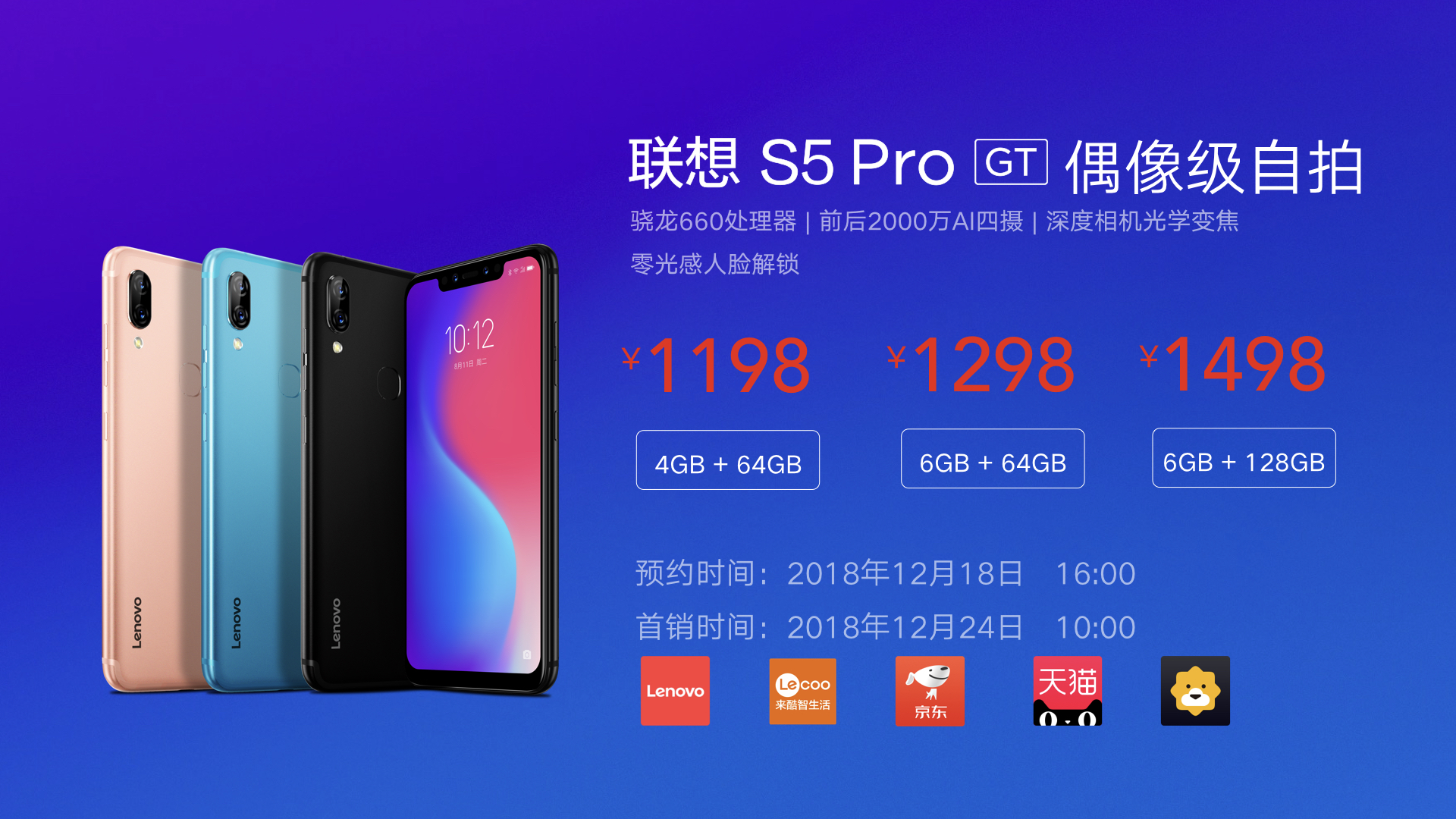 聯想S5 Pro升級版,配置升級,美麗升級,售價4 G+64G為1198元,6 G+64G為1298元,6 G+128G為1498元。12月18日在全平臺開啟預約,12月24日開啟首銷。