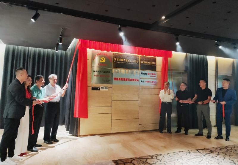 大浪時尚小鎮黨委第一書記劉繼琴、深圳市社會組織管理局副局長孫景明、大浪時尚小鎮建設管理中心主任曹宇昕、大浪時尚小鎮黨委專職副書記曾鳳,市政協委員、原市民政局處長駱冰,卡爾丹頓服飾股份有限公司品牌總監胡屹,市展示道具行業協會創會會長駱詩學,商業展示技術研究院、展示道具行業協會秘書長蘇建東,共同為商業展示總部基地揭牌。