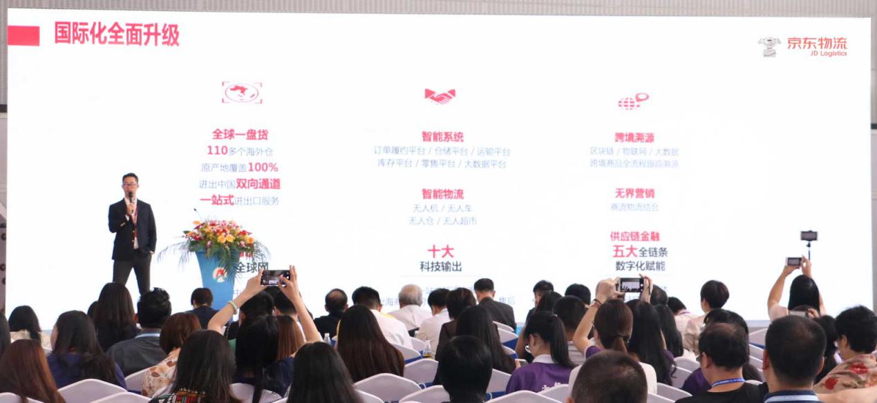大會同期舉辦了以“賦能與創新----擁抱全球貿易新趨勢”為主題的跨境電商展暨領袖峰會。會上,廣東亞太電子商務研究院負責人陳海權教授表示,中國經濟正在面臨新的挑戰,跨境電商的攻堅戰正在啟動,品牌化和全球供應鏈變革成為新命題。京東物流國際事業部華南區負責人李展鵬隨后發表了演講并表示:“多年來,中國經濟蓬勃發展,從早期產品制造Made in China,到海外商業模式Copy to China,再到目前優勢制造和電商物流行業在全球輸出Lead to Change。我們希望京東物流能助力中國企業跨境出海貨售全球、貨通全球,為全球提供’有速度更有溫度’的服務。”