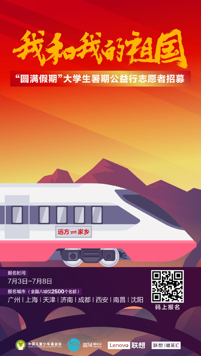 7月3日,由中國兒童少年基金會、北京圓網慈善基金會和聯想集團共同發起的“‘我和我的祖國’圓計劃—圓滿假期大學生暑期公益行”活動,面向全國8個城市的大學生正式開啟志愿者招募,邀請回鄉大學生加入到為廣大留守兒童群體量身定制的公益行動中,幫孩子團圓、為孩子圓夢、讓愛心圓滿。對于大學生來說,這將是一次獨特的公益實踐經歷。