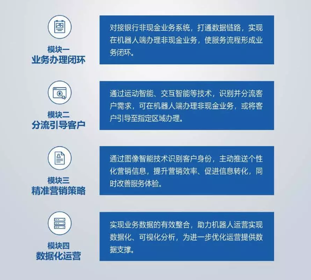 人工智能機器人與金融業務的完美結合,助力加速金融網點智能化建設、提升營銷效率、豐富金融營銷場景。