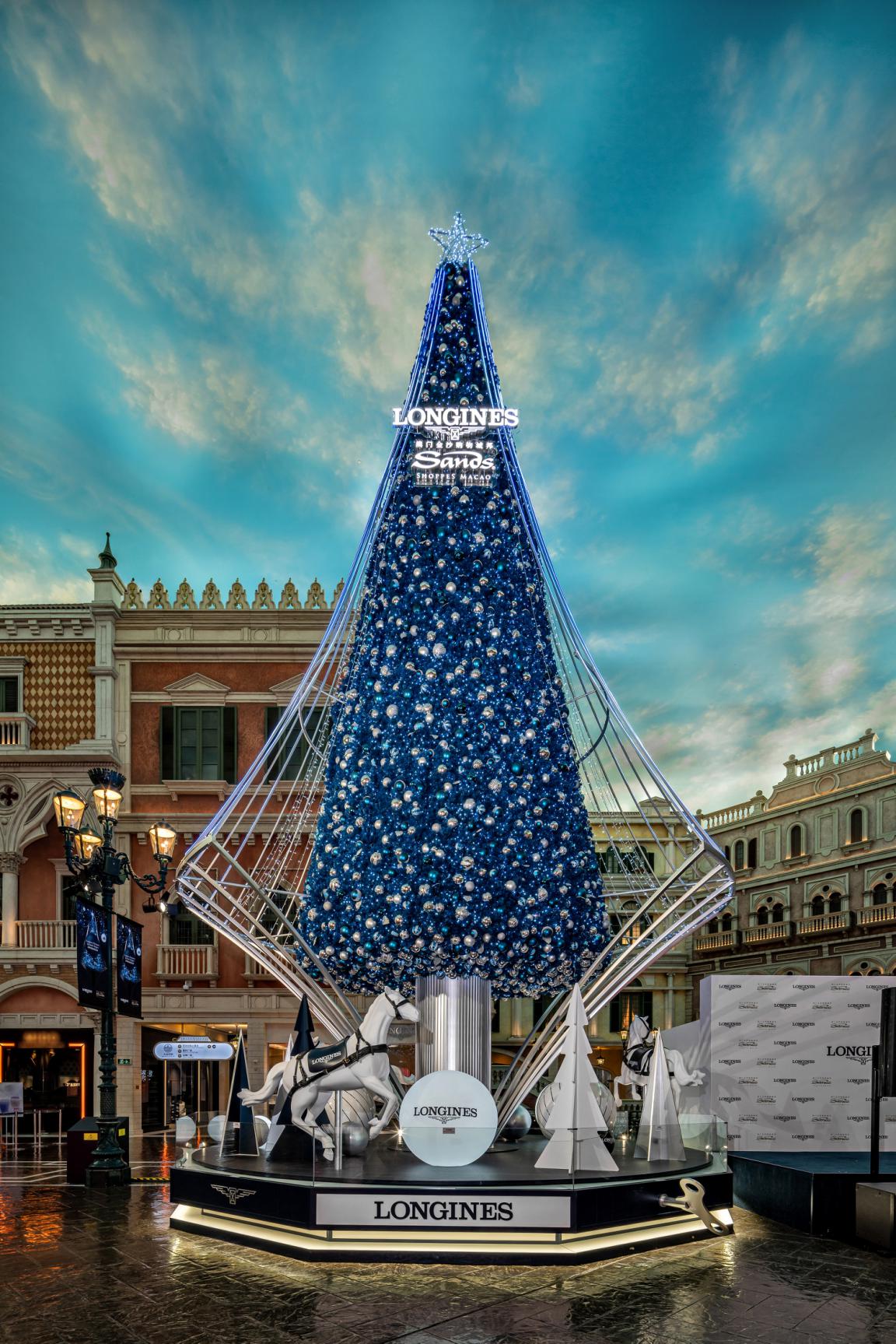 亮燈儀式于威尼斯人購物中心圣馬可廣場舉行,影視明星鐘嘉欣受邀出席,并與浪琴澳門副總裁鄭美齡、金沙中國有限公司零售市場推廣副總裁Rita Simonetta及金沙中國有限公司商場管理部總監梁俊強一同啟動高達13米的藍色菱形圣誕樹底部的音樂盒裝置。